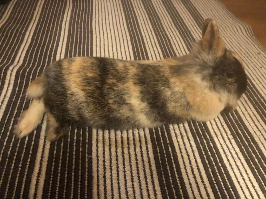 Det här är Tofu – en mycket social och kelen honkanin, troligtvis under Ã¥ret och av mindre blandras (nuvarande vikt 1,3 kg). Tofu hittades utomhus mitt i vintern men har levt som innekanin att döma av den tunna pälsen. Som tur var fÃ¥ngades hon snabbt in och klarade sig undan kyla och svält. Hon bor fortsatt inomhus i sitt jourhem där hon är frigÃ¥ende i eget rum med tillgÃ¥ng till öppna burar, toalett, grävlÃ¥da, gÃ¥ngar och mÃ¥nga sitthyllor att hoppa upp pÃ¥. Tofu är en bestämd dam som kräver lite kaninvana av sin blivande matte/husse och hon kan inte hanteras av mindre barn. Med rätt hantering är hon otroligt kelen och kan bli klappad och gosad med i timmar! Tofu är kastrerad och chipmärkt. Hon är nyfiken pÃ¥ katter och stressas inte av dem sÃ¥ länge de inte är i hennes rum. Tofu vill flytta till nÃ¥gon som har kaninvana och som kan fortsätta ha henne frigÃ¥ende samt (nästan allra viktigast) kan ge henne en kaninlivskompis!