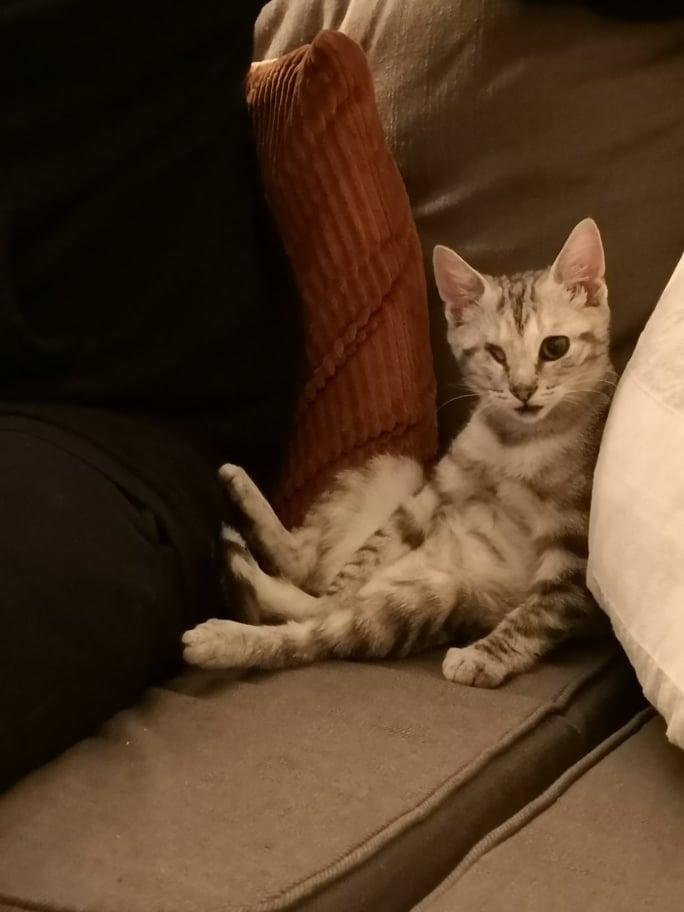 Hon tydde sig till oss direkt. Allt hon ville var att leka och kela. Idag är hon som vilken katt som helst. Hon har gått upp i vikt och fått en riktigt vacker päls. Hon busar, studsar och leker tafatt med sina jourhemskompisar. Att hon bara har ett öga stoppar inte henne. När hon blir trött så vill hon gärna ligga nära och mysa. Helst på bröstkorgen så nära ansiktet som möjligt. Hon är en social katt som gärna vill ha uppmärksamhet hela tiden och vill vara med och se vad man gör. Nu när Möris blivit frisk, och tillräckligt stor, så ska det missbildade ögat opereras bort, kostnad ca 10.000 kr, och ögonhålan sys igen. Sedan är vår lilla krigare klar att adopteras ut till ett tryggt och kärleksfullt hem.