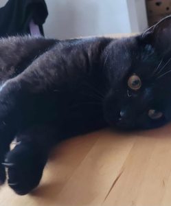 Jag heter Skotte och är en liten helsvart kille på ca 1 år. I mars hittades jag vid infarten i Landskrona, övergiven och hungrig. Upphittaren tog hem mig och efterlyste min ägare. Det visade sig att jag varken var chipmärkt eller kastrerad. Det var ingen som svarade att de saknade mig. Jag fick komma till ett av jourhemmen där det fanns en annan katt som jag kom väldigt bra överens med.