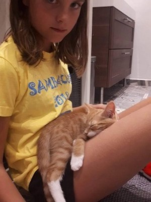 Lilla Svante, en av kattungarna från Vadensjö, har idag fått flytta till sitt nya hem. Han har varit i stödhemmet cirka en månad och har blivit vaccinerad rvå gånger, chippad och avmaskad. Djurskyddet kommer att betala kastreringskostnaden för honom när han är gammal nog, och vi har adopterat ut honom för en kostnad av 1200 kr. Vi önskar Svante lycka till i nya hemmet. Bilden är från nya hemmet där han somnat nöjd och belåten efter lek och alla nya intryck. (vi har fått tillåtelse av familjen att publicera bilden).