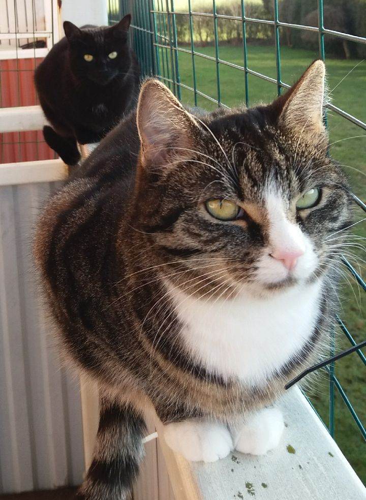 Mitt namn är Vanjie och det är jag som är tigrerad. Jag är väldigt framåt men kan bli lite försiktig och blyg i början, men jag är absolut inte svårflörtad. Det bästa jag vet är att få vara ute och känna den friska luften, klättra i träd och känna gräset under mina tassar.