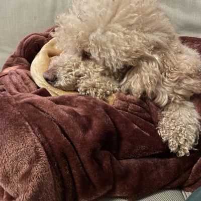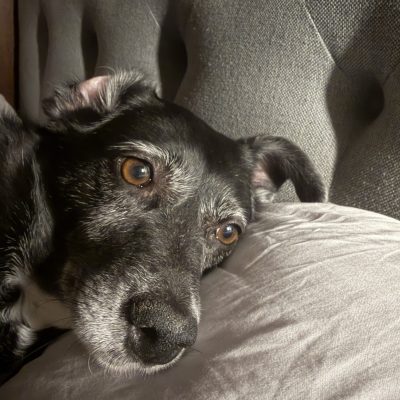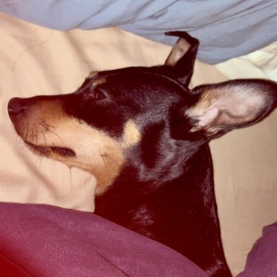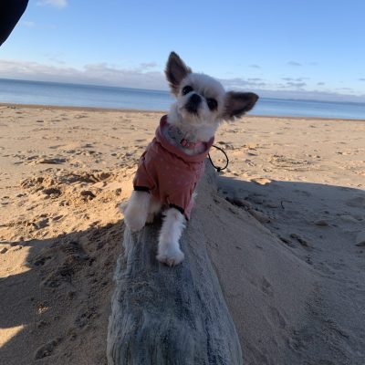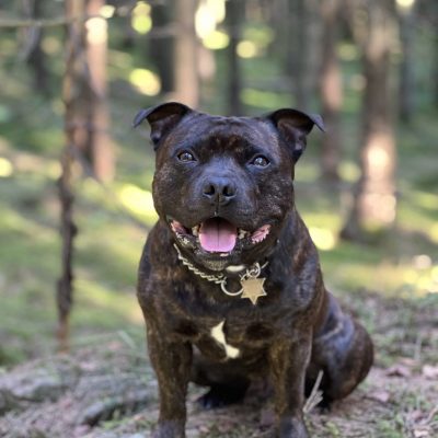 Quinnie är stressad och flåsig så fort det smälls även på långt håll. Veckorna innan och efter är alltid problematiska och man undviker att lämna henne ensam en sekund.
