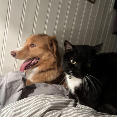 Katten hålls inne. Reagerar på minsta ljud. Vill vara nära. Trycker sig mot hunden tom.