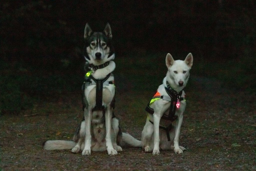 1. Foto din hund med blinklampan tänd i skymning eller mörker.