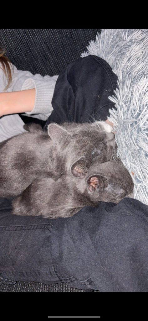 Hennes bror (veterinären tror att de är från samma kull) den gråa med vita tassar och vitt bröst, hänger gärna med sina killkompisar, men är också nyfiken på omgivningen.