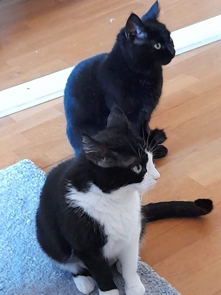 Pussi (svart/vit) och Kompis (svart) söker nu sitt nya för-alltid-hem antingen tillsammans eller var för sig. Båda tjejerna är sällskapliga, går och stryker sig efter benen på jourhems-matte. Pussi tycker om att ligga i soffan och Kompis har gärna en egen sovplats och pratar gärna tyst med sin matte/husse. Katterna är mycket lekfulla, fungerar med hundar men lite reserverade mot barn (finns inga barn i jourhemmet så det är nog inga problem bara dom blir vana).