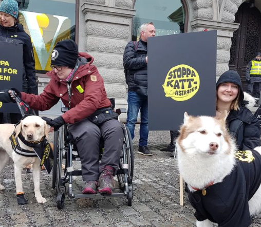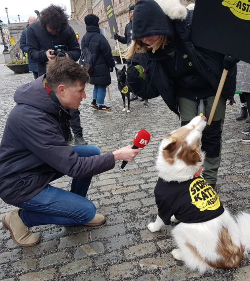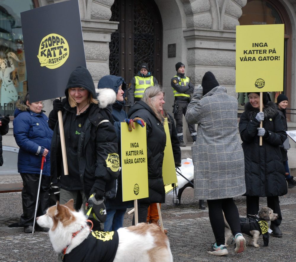 Torsdag 17 februari tog sig ordförande för Djurskyddet Stockholm Norrort, Linnéa Stjernberg, till Mynttorget med sin hund Lana för att demonstrera för katternas rättigheter.